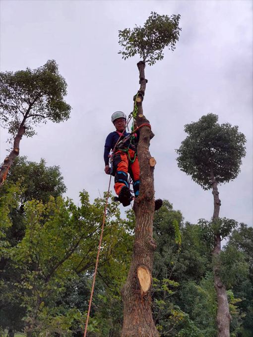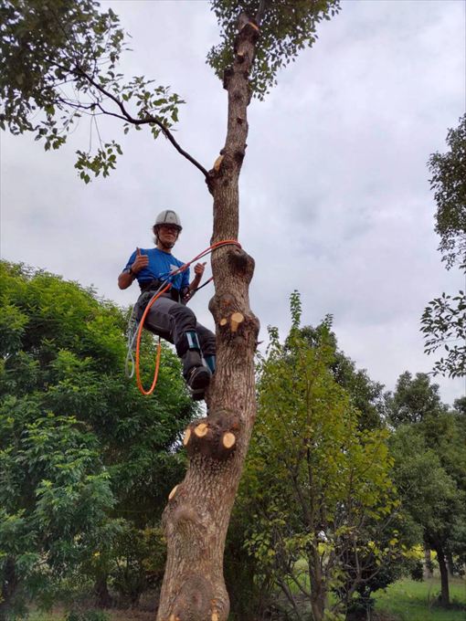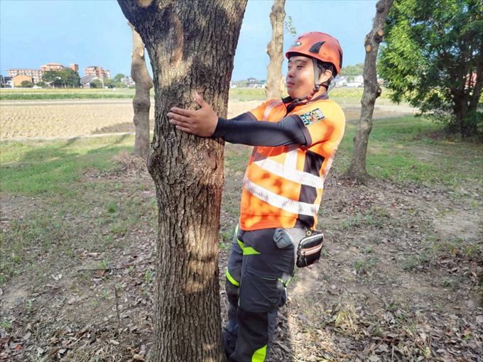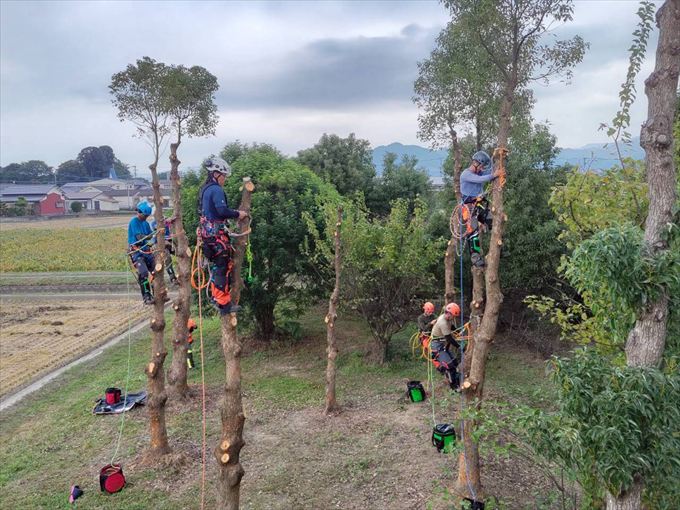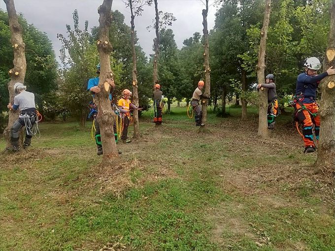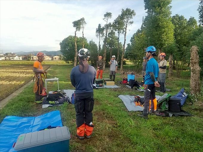 1日目は各個人でスパイクを装着しての上り下りやカッティング練習、2日目に入るとチームに分かれてリギングをセットしての作業を行いました。受講者の多くが、慣れないスパイクでのクライミングで1日目は悪戦苦闘されていましたが、2日目も自分のレベルに合わせ、LOW&SLOWで技術の習得に臨みました。