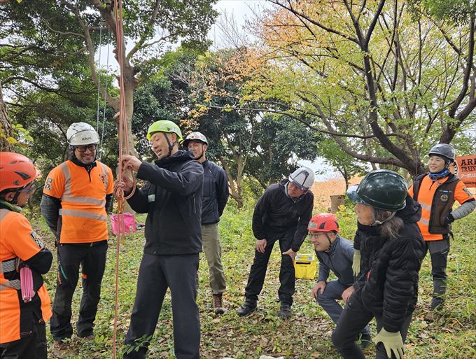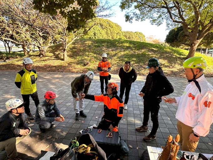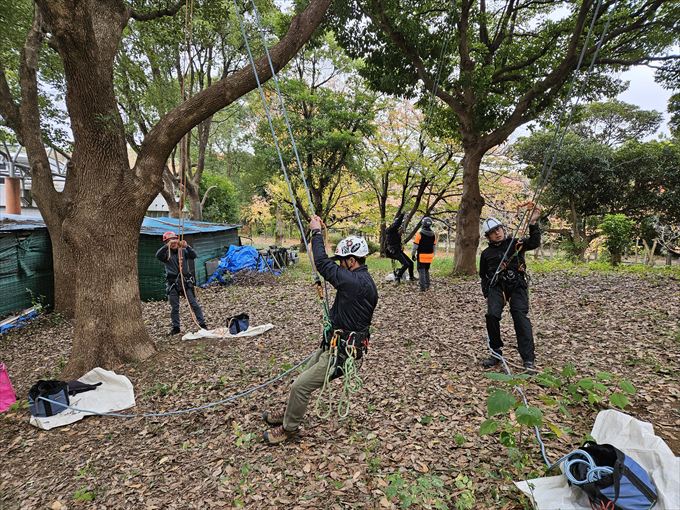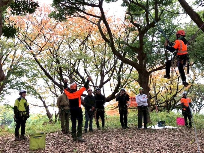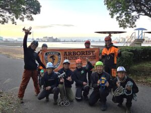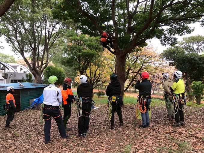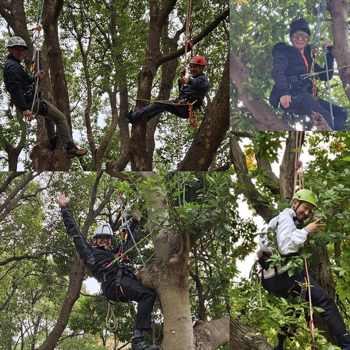 快晴、澄んでいます、お天気に恵まれました。アーボリカルチャー、ツリークライミングの基礎を学び日常のツリーケアへ新しい出会い、新しい観点、皆で熱心に取り組みました。