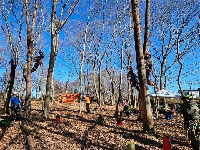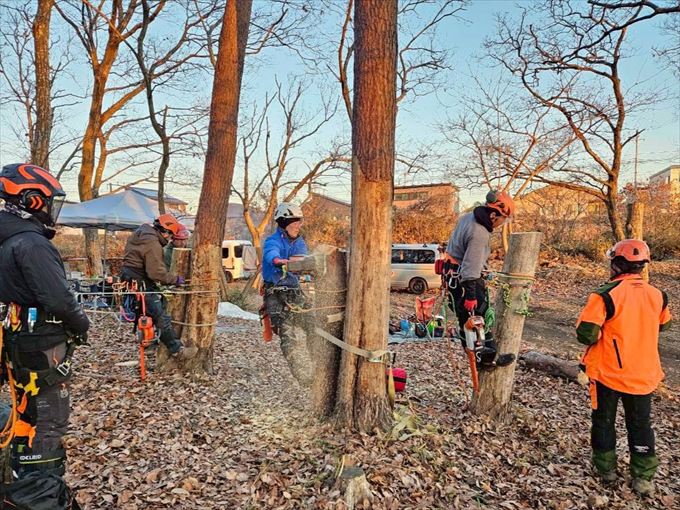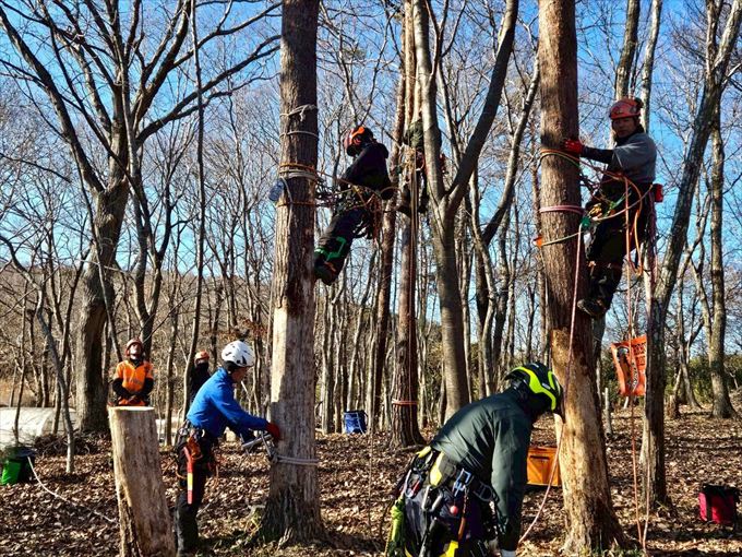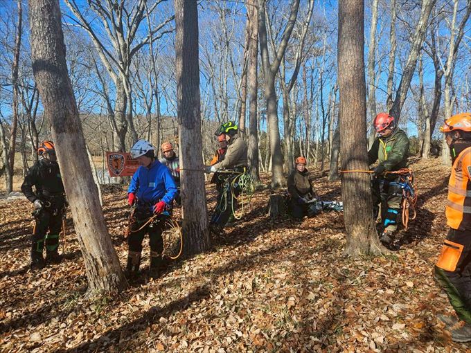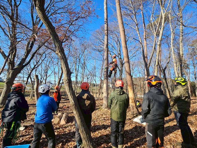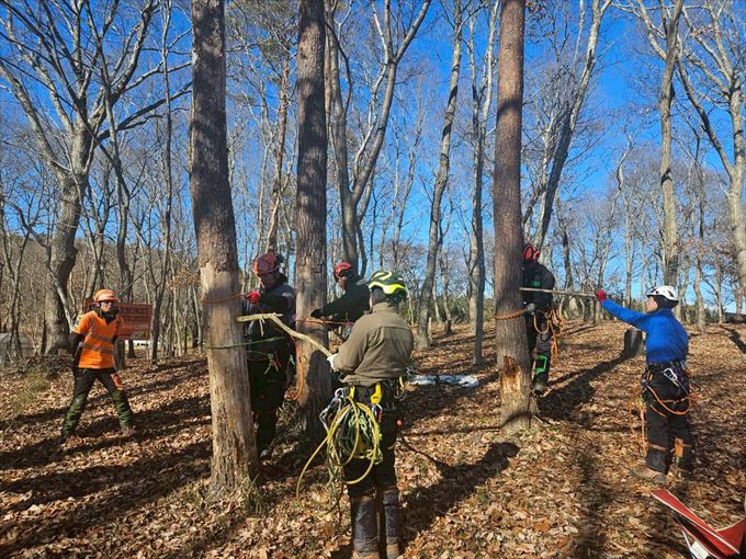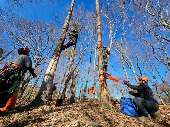 もう一つの樹上へのアクセス——スパークライミング。 樹上断幹においては、足元にスパイクを履き、ロープを自在に調整しながら安定した体勢を保つことが求められます。 前半では、このスパークライミングを通じて、身体と樹との関係性を丁寧に構築していきました。後半はMRSとリギングへと連動し、樹上でチェーンソーを扱うための“かたち”へと技術を紡ぎます。 基本手順を潜在的に動かせるよう、LOW&SLOWのリズムで反復訓練を重ねました。また、グランドテクニシャンとしての視点から、見逃してはならない注意点や支援の在り方についても多くを学びました。3人のトレーナーと過ごした3ABの3日間は、技術だけでなく信頼と身体感覚の深化をもたらす時間となりました。