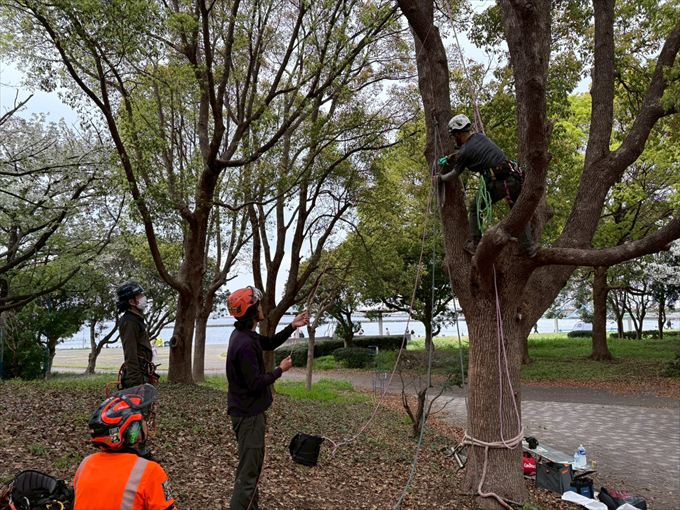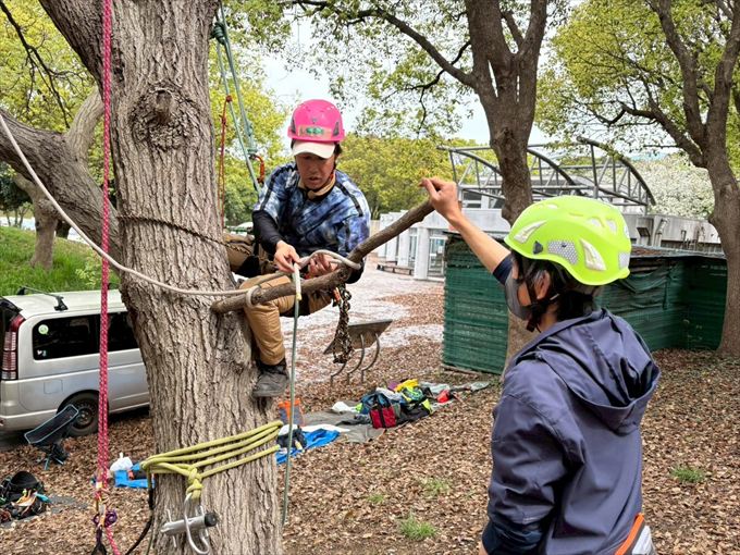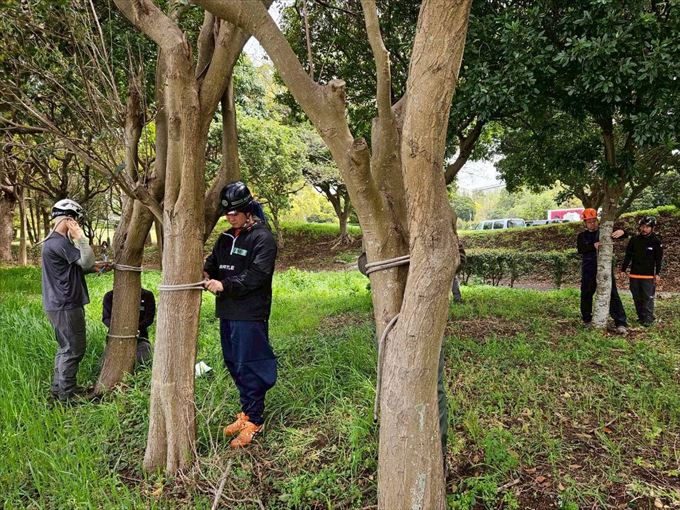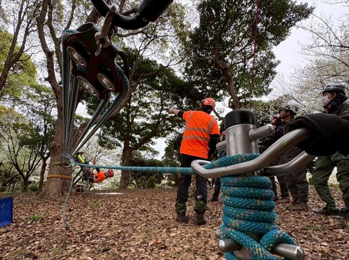 BAT2では、支点の設定・姿勢保持・地上との連携など、現場で求められる基本動作を樹上で進めます。 トレーナーの解説を通してリギングシステムの構造や荷重の流れを理解しました。確実な安全作業につながる判断力を養い、チームワークを共有しました。 夕刻の会場を静かな余韻が鮮やかに包み込みました。またお会いしましょう。